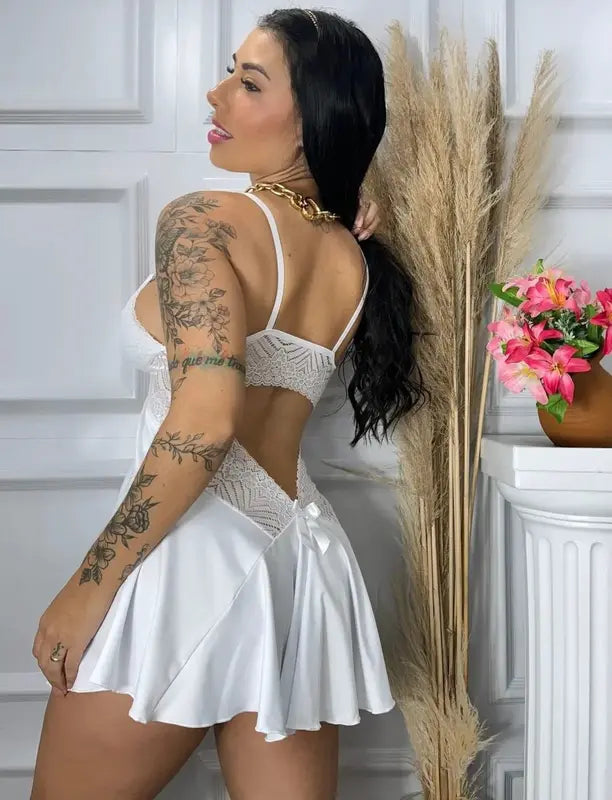 Este camisola combina delicadeza e sensualidade em cada detalhe. O tecido macio e fluido valoriza suas curvas com leveza, enquanto o acabamento em renda e o laço frontal adicionam um toque romântico e sofisticado. Ideal para noites especiais ou momentos de autocuidado, ele oferece conforto e charme em medida perfeita.