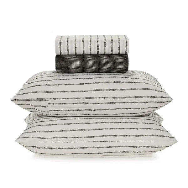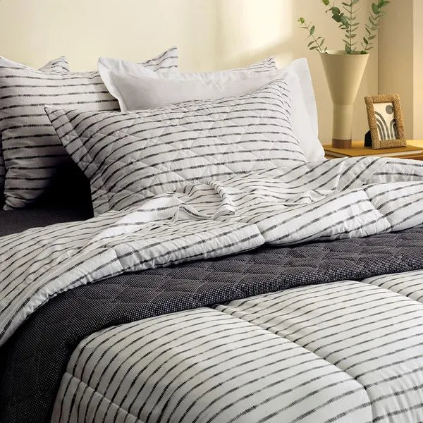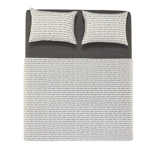 Com o jogo de cama Mendi, estilo e conforto se entrelaçam. A estampa minimalista de linhas pretas pontilhadas sobre o branco cria uma harmonia visual. O toque sensorial do algodão 100% e o cuidado com o fio penteado garantem não apenas noites tranquilas, mas também um visual encantador para o ambiente.
