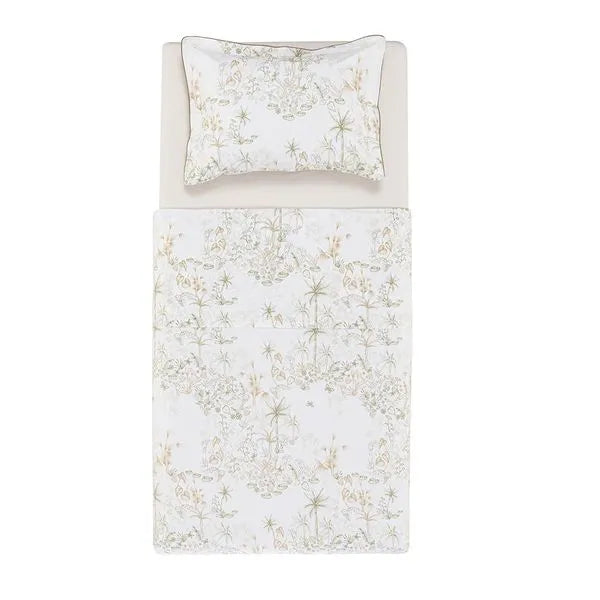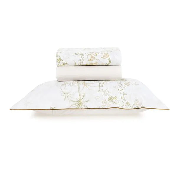 O Jogo de Cama 180 Fios Percal 100% Algodão Costine acompanha sobre lençol com dobra feita, lençol com elástico e fronha com cordonê contrastante aplicado nas três laterais. Sua estampa remete à natureza e seu frescor, com palmeiras e folhagens que vão adicionar um toque de tranquilidade e paz ao seu quarto e proporcionar noites revigorantes em meio à maciez do tecido percal.