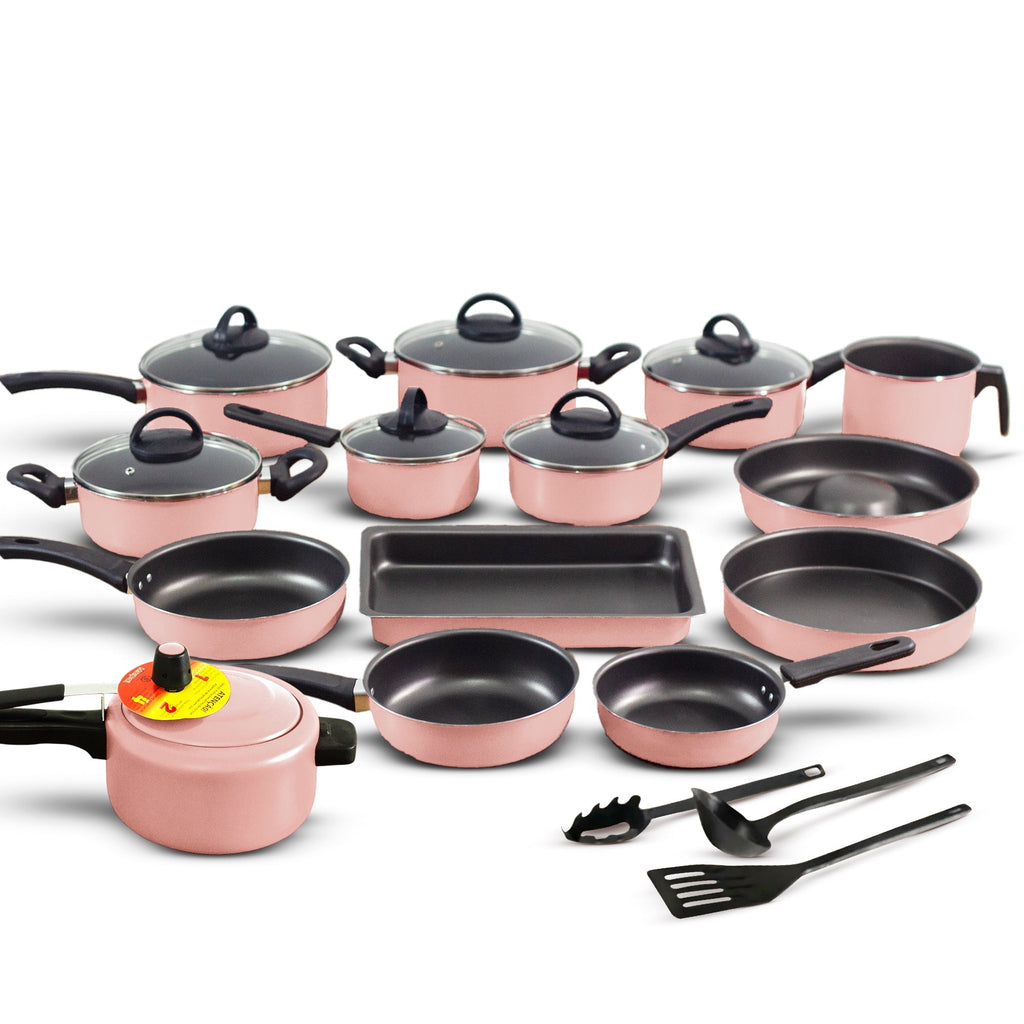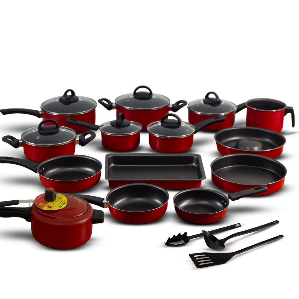Conjunto Trofa 17 peças com Panela de Pressão 3L, disponível para trazer modernidade e praticidade à sua cozinha com excelente custo-benefício. Com 5 camadas de revestimento antiaderente e espessura de 1,2 mm, as panelas proporcionam cozimento uniforme e são de fácil limpeza. As tampas de vidro temperado, com saída de vapor, oferecem visibilidade total durante o preparo. Pegadores anatômicos em baquelite antitérmico garantem segurança no manuseio.